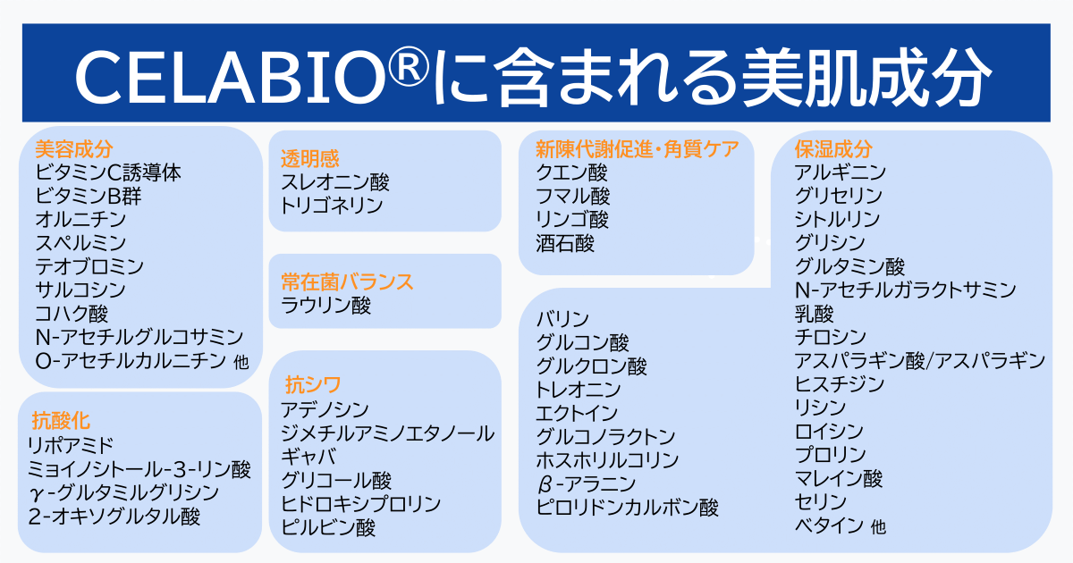 「CELABIO®(セラビオ)」には、保湿や抗シワ、抗酸化作用のある多くのアミノ酸が含まれています。