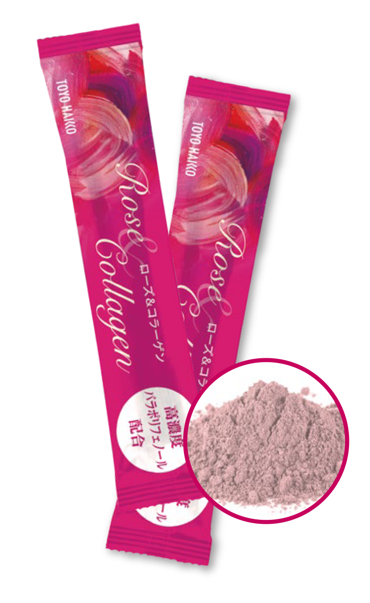 高濃度バラポリフェノール配合「バラコラーゲン美容顆粒」やローズクリスタ70原料サンプルを用意しています。