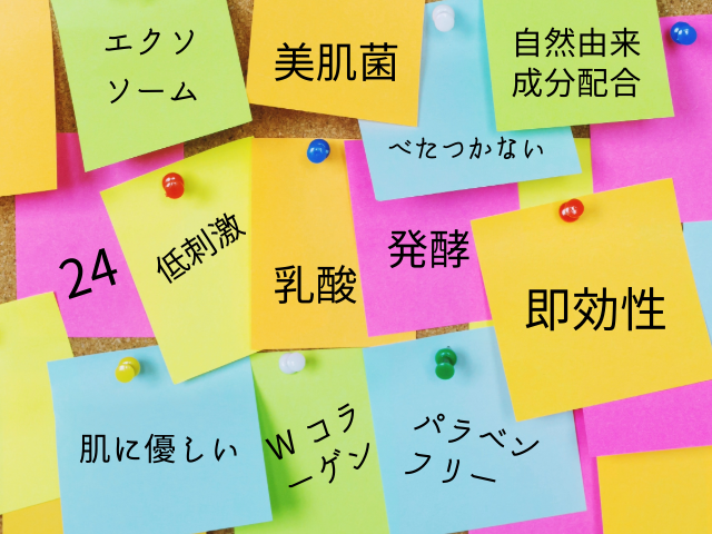 なんでもOKです。配合成分や製造工程、使用感、効果の持続性、デザインなど、さまざまな角度からその商品の特徴をリストアップします。