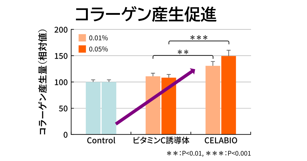 さらに、セラビオは線維芽細胞の増殖によって、細胞が生成するコラーゲンやエラスチン、ヒアルロン酸の産生を促します。ヒト試験による抗シワやハリ改善効果が確認されています。