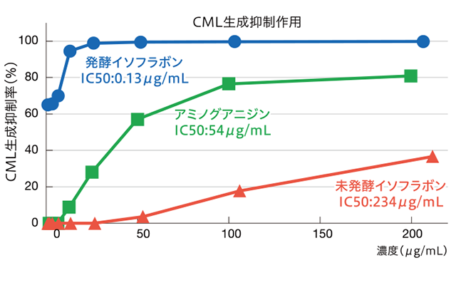 発酵イソフラボンは、AGEsの一種であるCML生成を強く阻害することが確認されており、その効果は未発酵イソフラボンやアミノグアニジンよりも高いことが確認されました。