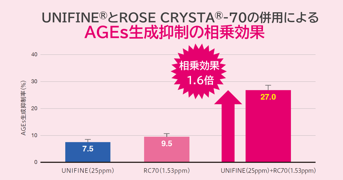ユニファインとローズクリスタ-70を併用することによって、AGEsの生成抑制効果が1.6倍になります。
