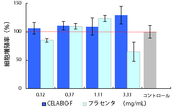 <結果> CELABIO-Fには、各濃度において細胞数がコントロールと比較して増殖しており、細胞賦活作用のあることが確認された。また、市販品プラセンタエキス(豚由来,エキス分33%)と比較したところ、低濃度域において特に効率的に細胞賦活機能があり、プラセンタと比較して優位性が確認された。CELABIO-Fは、線維芽細胞が活発に増殖することにより、細胞から作られるコラーゲンやエラスチン、ヒアルロン酸といった成分の産生も活発となり、老化防止効果を有することが期待できる。