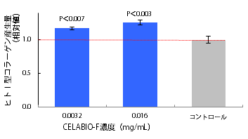 <結果> CELABIO-F存在下で有意にコラーゲン産生促進効果が認められ、コントロールと比較して約125%の産生促進効果が確認された。CELABIO-Fを与えられた細胞がコラーゲンを活発に産生するようになったことから、CELABIO-Fはシワやタルミなどを改善する効果を有することが期待できる。