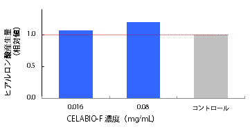 <結果> CELABIO-F存在下でヒアルロン酸産生促進傾向が認められ、コントロールと比較して約110〜120%の産生促進効果が確認された。CELABIO-Fを与えられた細胞がヒアルロン酸を活発に産生するようになったことから、CELABIO-Fはシワやタルミなどを改善する効果を有することが期待できる。