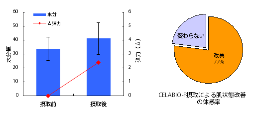 <結果> CELABIO-Fの連続摂取により、肌水分および弾力の改善が認められた。モニターアンケート結果、肌状態改善の体感率は77%であった。