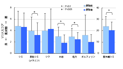 <結果> CELABIO-Fを28日間連続摂取することにより、シミ、毛穴、キメにおいて有意な改善または改善の傾向が確認された。