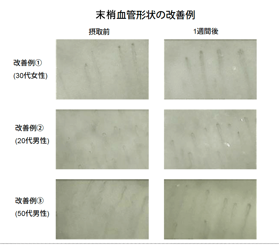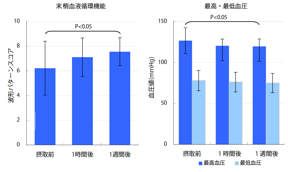 また、末梢血管の形状観察による改善例も確認され、1週間の連続摂取により血管のゴースト化が軽減された。血圧については、最高血圧が単回摂取の1時間後に低下の傾向が見られ、1週間の連続摂取により有意な低下が確認された。