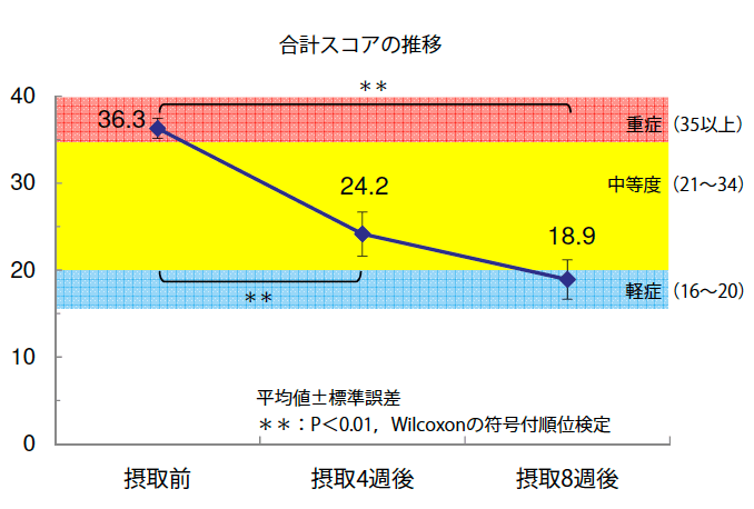 CELABIO-Fを4週間または8週間摂取することにより、摂取前に重症域であったスコアが中等度域または軽症域のスコアにまで有意に低下し、更年期不定愁訴改善効果が認められた。