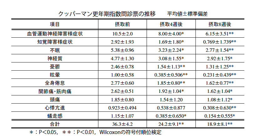 CELABIO-F摂取量は495mg/日、摂取期間は8週間とし、摂取前、摂取4週後、摂取8週後におけるクッパーマン更年期指数を測定比較した。