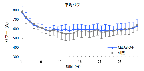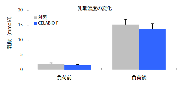 コントロール群に比べCELABIO-F摂取群において運動負荷10分後よりパワーの低下が抑えられ、運動パフォーマンスの向上が見られた。また、運動後の乳酸濃度もCELABIO-Fを摂取することにより、摂取しないときと比較して低く抑えられる傾向が観察された。