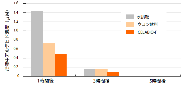 <試験方法> 社内の健康な成人男性2名に、水、ウコン飲料(クルクミン30mg配合)、CELABIO-F(5%水溶液)100mLを摂取させた。30分後、エタノール濃度5%のビール700mLを30分かけて飲んでもらい、その後1、3、5時間後だ液を摂取し唾液中のアルデヒド濃度を測定した。