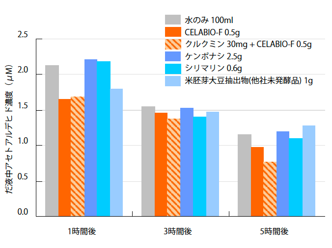 <試験方法> 健康な成人男性に1名あたり4回試験を行なってもらった。のべ試験数は、水のみ13名、CELABIO-F群13名、クルクミン+CELABIO-F群8名、ケンポナシ群6名、シリマリン群6名、米胚芽大豆抽出物(他社未発酵品)群5名にて実施した。試験物質を水100mLとともに摂取し、30分後からビール700mLを30分かけて飲んでもらい、その後1、3、5時間後にだ液を採取し、アルデヒド濃度を測定した。