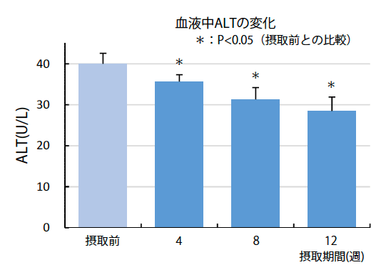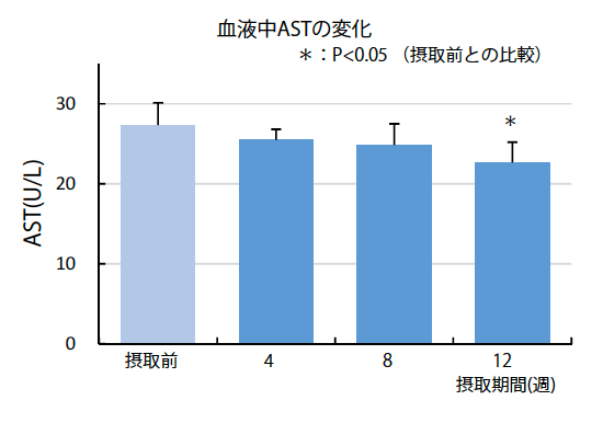 <結果> CELABIO-Fを摂取することにより、血液中ASTは摂取12週目において、血液中ALTは4週目以降においてそれぞれ有意に低下し、体内において肝臓機能改善効果のあることが確認された。