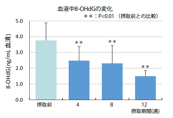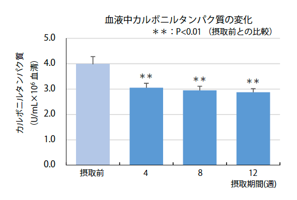 <結果> CELABIO-Fを摂取することにより、血液中8-OHdGおよびカルボニルタンパク質どちらとも摂取後4週目以降に有意に減少し、体内において抗酸化機能が発揮されていることが確認された。