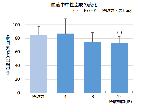 <結果> CELABIO-Fを摂取することにより、血液中中性脂肪が摂取8週目以降に減少する傾向が確認され、摂取12週間後において有意差が確認された。