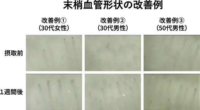 また、末梢血管の形状観察による改善例も確認され、1週間の連続摂取により血管のゴースト化が軽減された。血圧については、最高血圧が単回摂取の1時間後に低下の傾向が見られ、1週間の連続摂取により有意な低下が確認された。