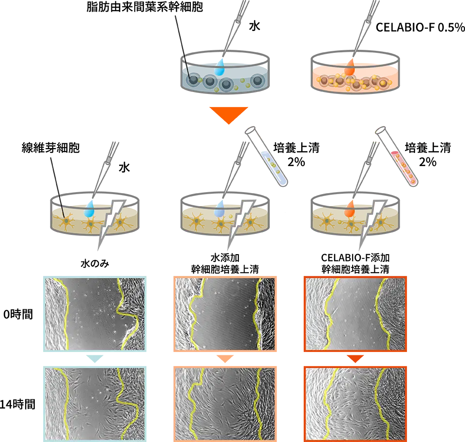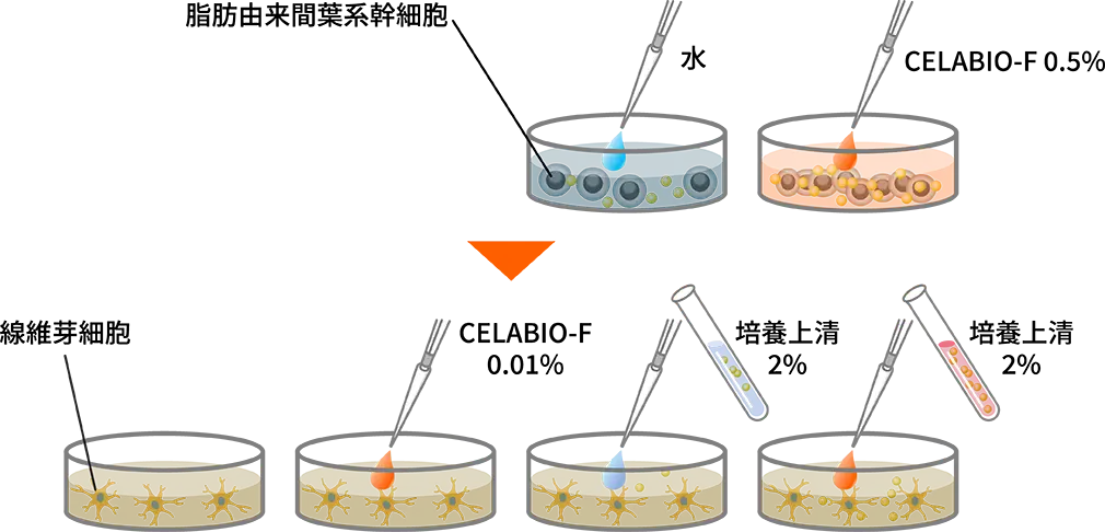 脂肪由来間葉系幹細胞をCELABIO-F含有培地で培養した後、その培養上清を回収した。この時、水のみを投与した幹細胞培養上清も比較のために回収した。