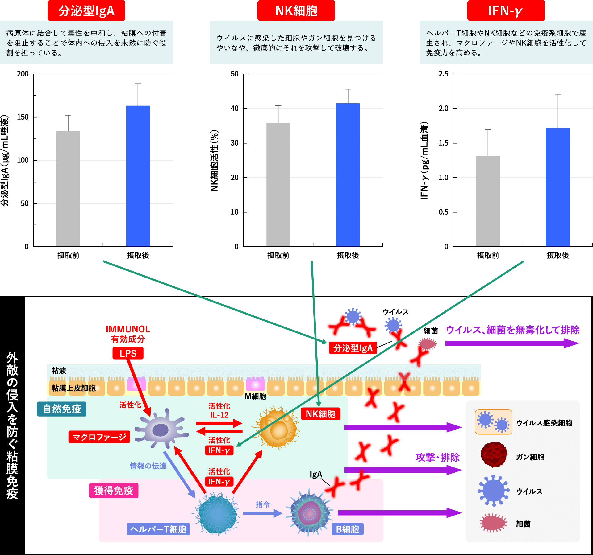 <結果> IMMUNOL 100mg摂取により分泌型IgA、NK細胞活性、IFN-γが増強されたことから、IMMUNOLは粘膜免疫機能を活性化することにより、外敵の侵入を防ぐ感染症対策素材としての利用が期待できる。