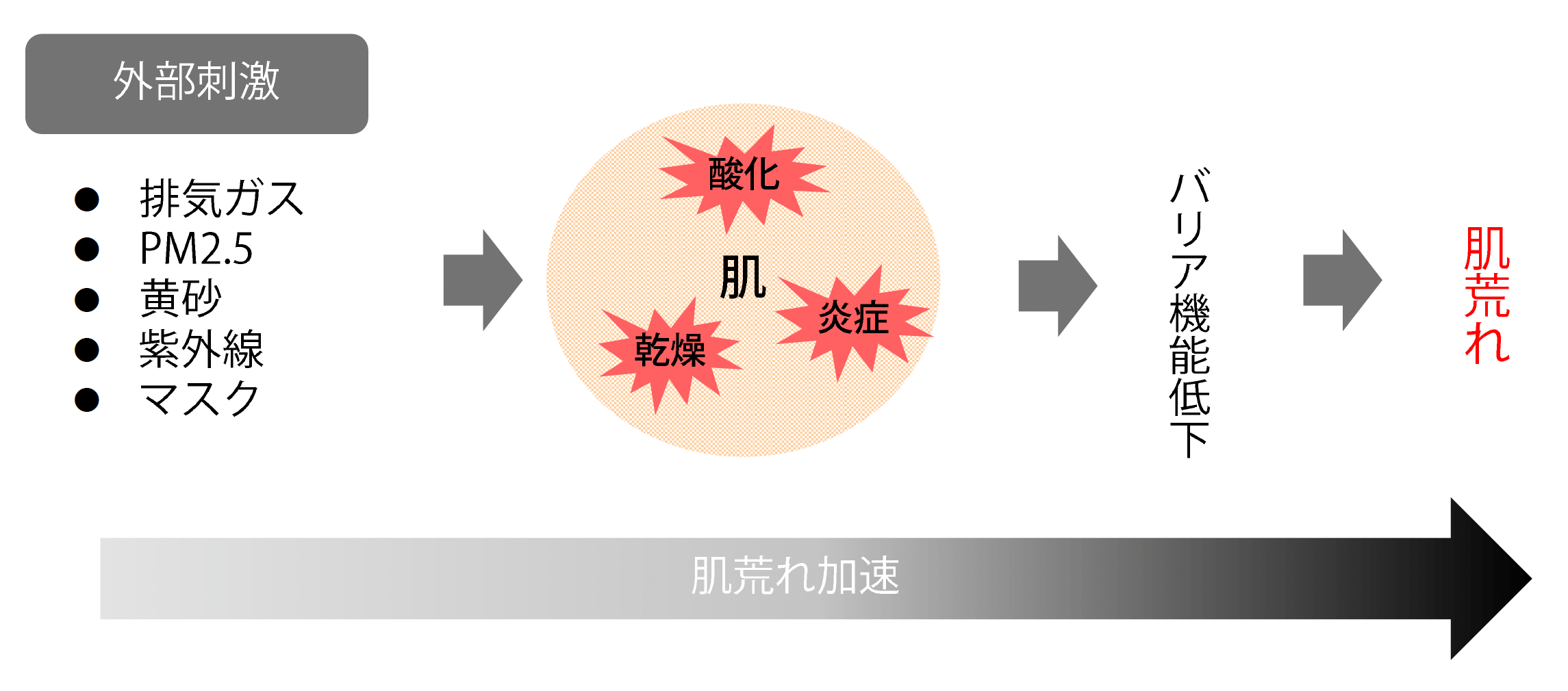 外部刺激からの肌ストレスにより肌のバリア機能が低下すると、外部刺激の影響を受けやすくなります。その結果、肌荒れが加速し、肌トラブルが深刻化します。