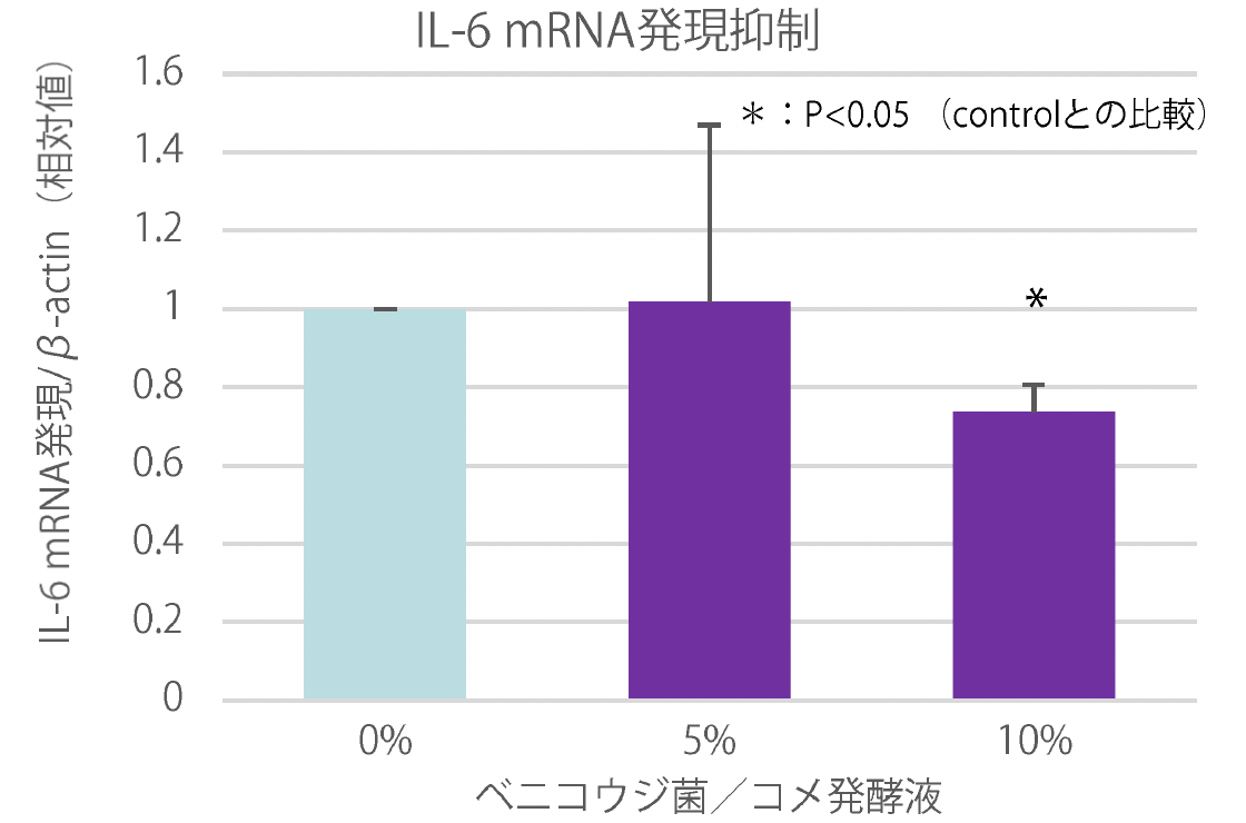 結果として下記グラフに示すようにベニコウジ菌/コメ発酵液はIL-6の遺伝子発現量を抑制することが確認された。