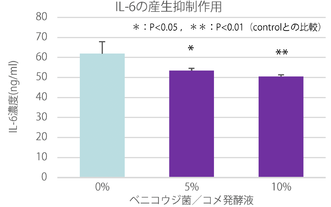 結果として、ベニコウジ菌/コメ発酵液の濃度依存的なIL-6の抑制が確認された。ベニコウジ菌/コメ発酵液は肌の炎症を抑制することが期待される。