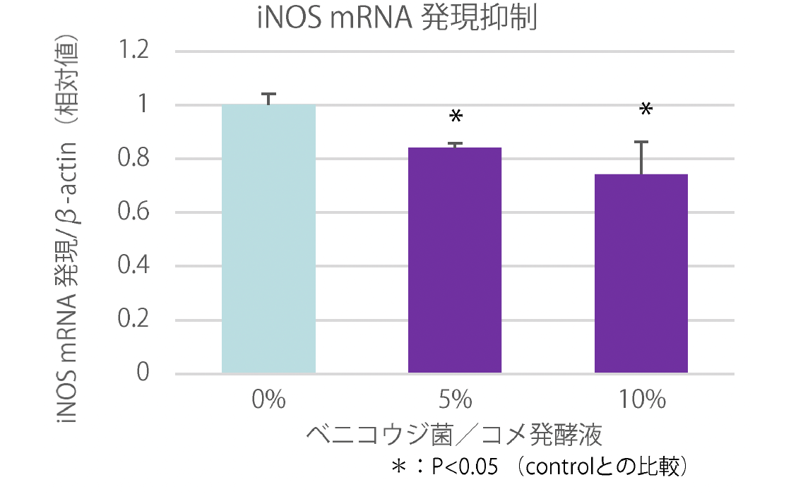 本試験ではマクロファージ様細胞RAW264を用いて、ベニコウジ菌/コメ発酵液における、NO産生を誘導する誘導型一酸化窒素合成酵素(iNOS)の遺伝子発現量の抑制評価、及びNOの産生抑制の評価を行った。iNOSの遺伝子発現量はマクロファージ様細胞RAW264の培養液に、炎症を誘導する大腸菌由来のリポ多糖とベニコウジ菌/コメ発酵液を加えて24時間インキュベートした後、細胞よりRNAを抽出し、Real