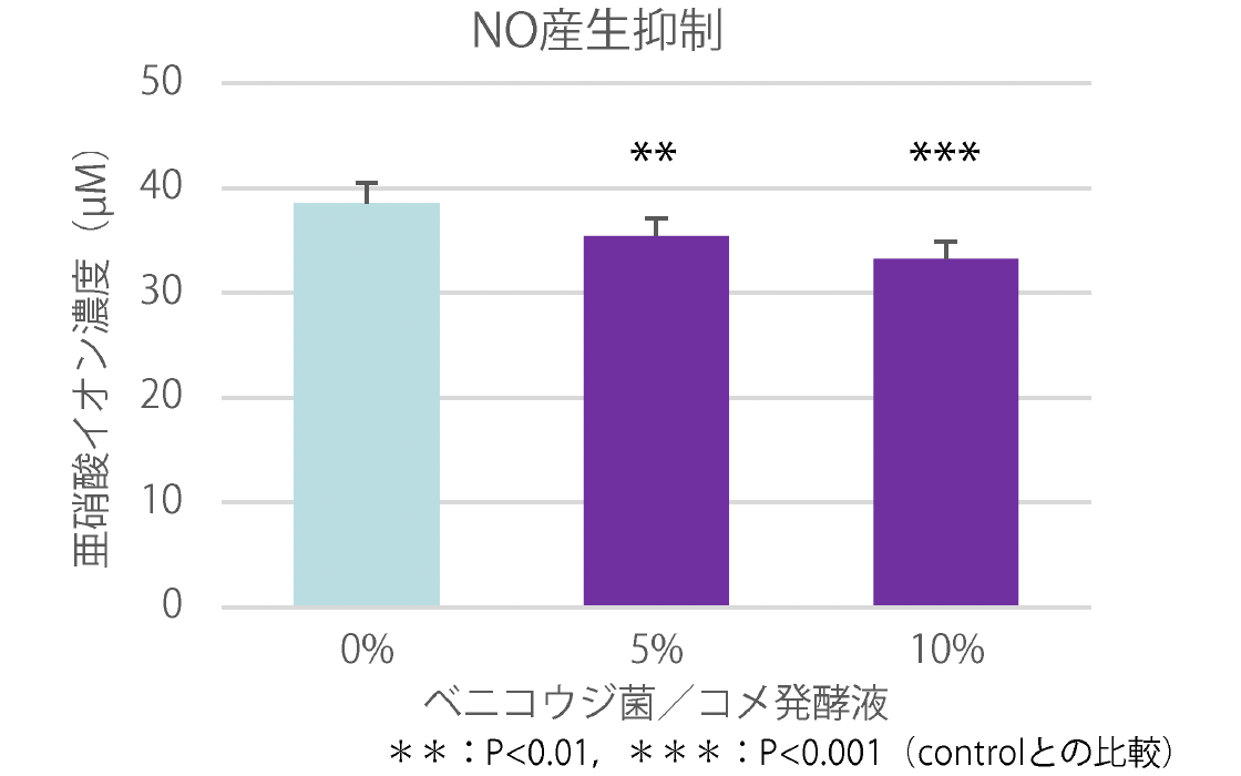 結果として、ベニコウジ菌/コメ発酵液の濃度依存的なiNOSの遺伝子発現量とNO産生量の抑制が確認された。ベニコウジ菌/コメ発酵液は、炎症によりもたらされる肌荒れを抑制することが期待される。