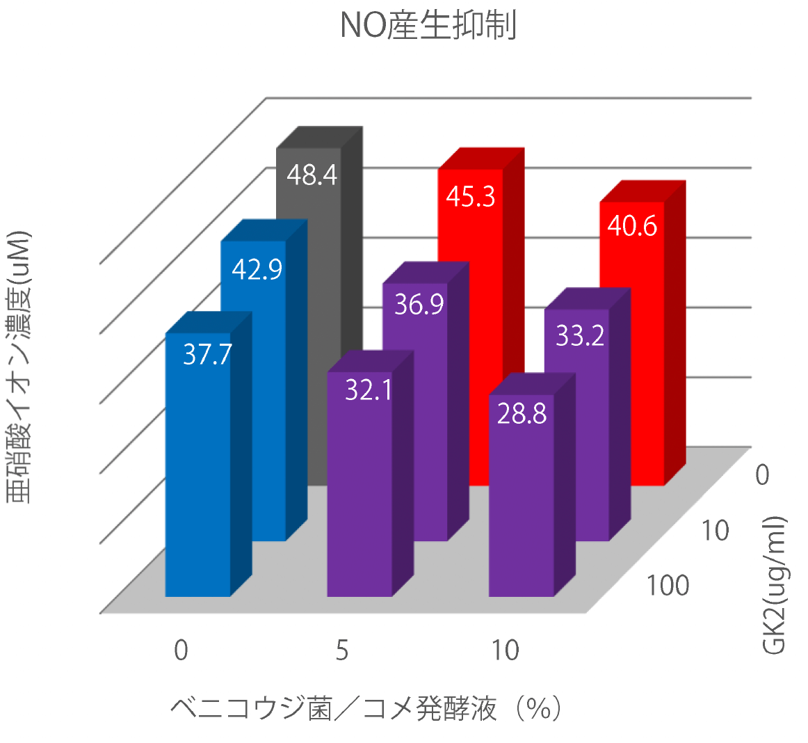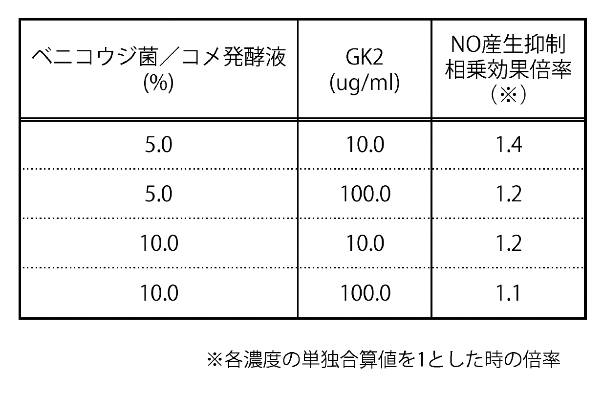 結果として、NO産生抑制の相乗効果が確認された。ベニコウジ菌/コメ発酵液は、グリチルリチン酸ジカリウムと併用することで、炎症によりもたらされる肌荒れをより一層抑制することが期待される。