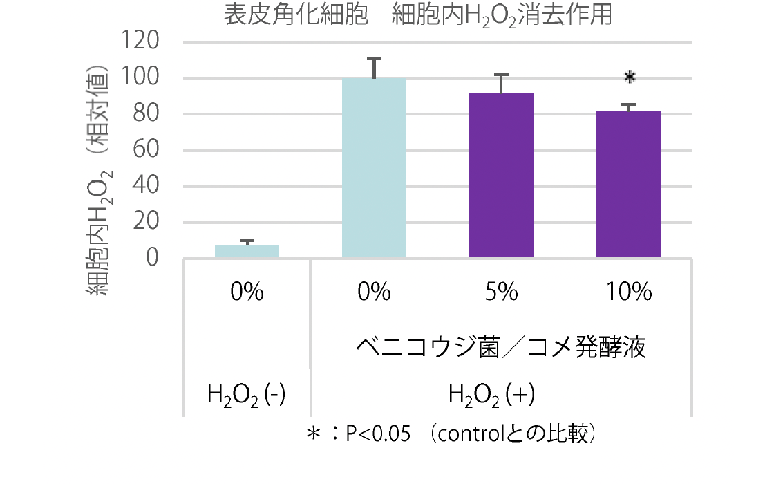 ベニコウジ菌/コメ発酵液でプレ培養した表皮角細胞に蛍光プローブを与え細胞内に取り込ませた後、ベニコウジ菌/コメ発酵液の存在下で、活性酸素種として過酸化水素(H2O2)を表皮角化細胞に暴露させ、H2O2を取り込ませた状態での発酵液による細胞内のH2O2の消去能を評価した。H2O2は細胞に暴露すると、速やかに細胞に浸透し、細胞内のH2O2濃度が上昇する。細胞内に取り込まれたH2O2を蛍光測定により評価した。またH2O2は、細胞内で生じる活性酸素のうち、最も長寿命である事に加え、細胞傷害性がきわめて高いヒドロキシラジカルを発生する。結果として下記に示すようにベニコウジ菌/コメ発酵液はH2O2を濃度依存的に消去し、表皮細胞への酸化ダメージを抑制することが示唆された。