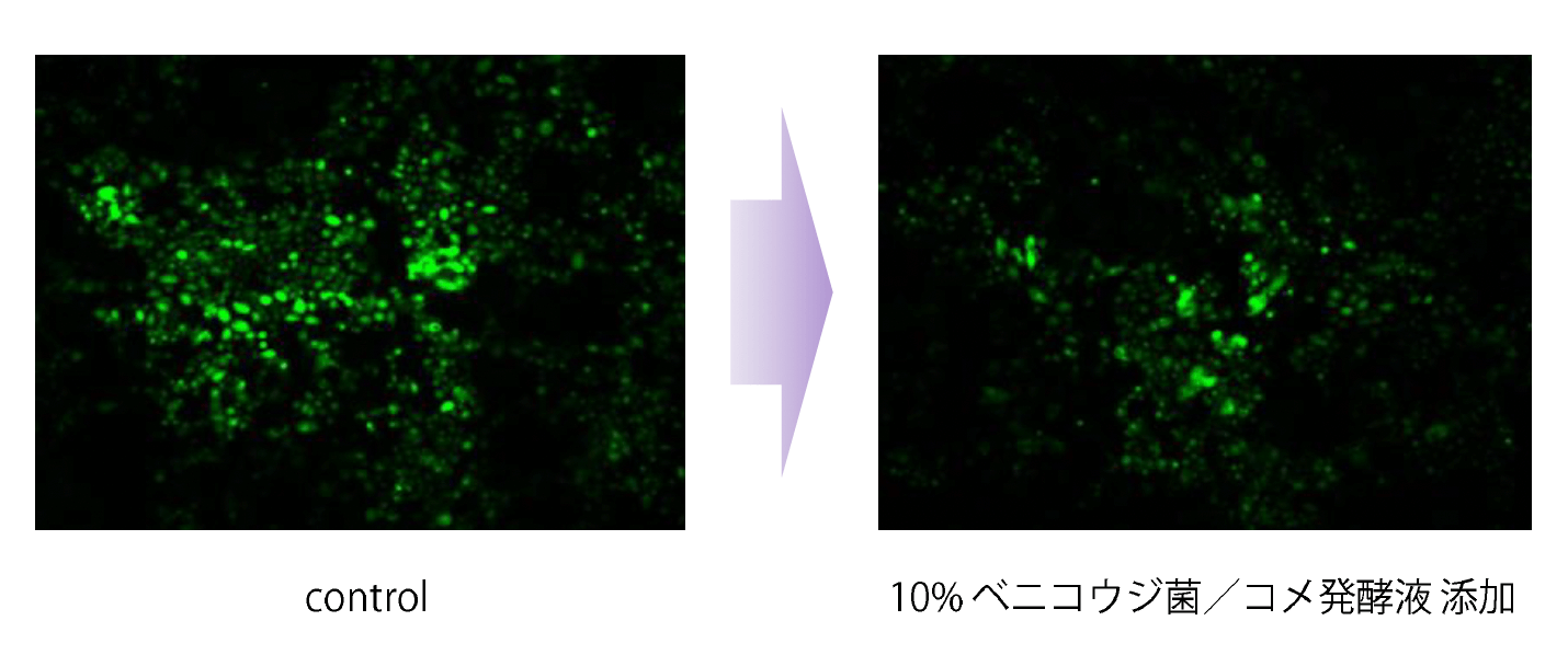 まず本試験では、正常ヒト表皮角化細胞(NHEK)を用いてベニコウジ菌/コメ発酵液による活性酸素の消去能を評価した。
