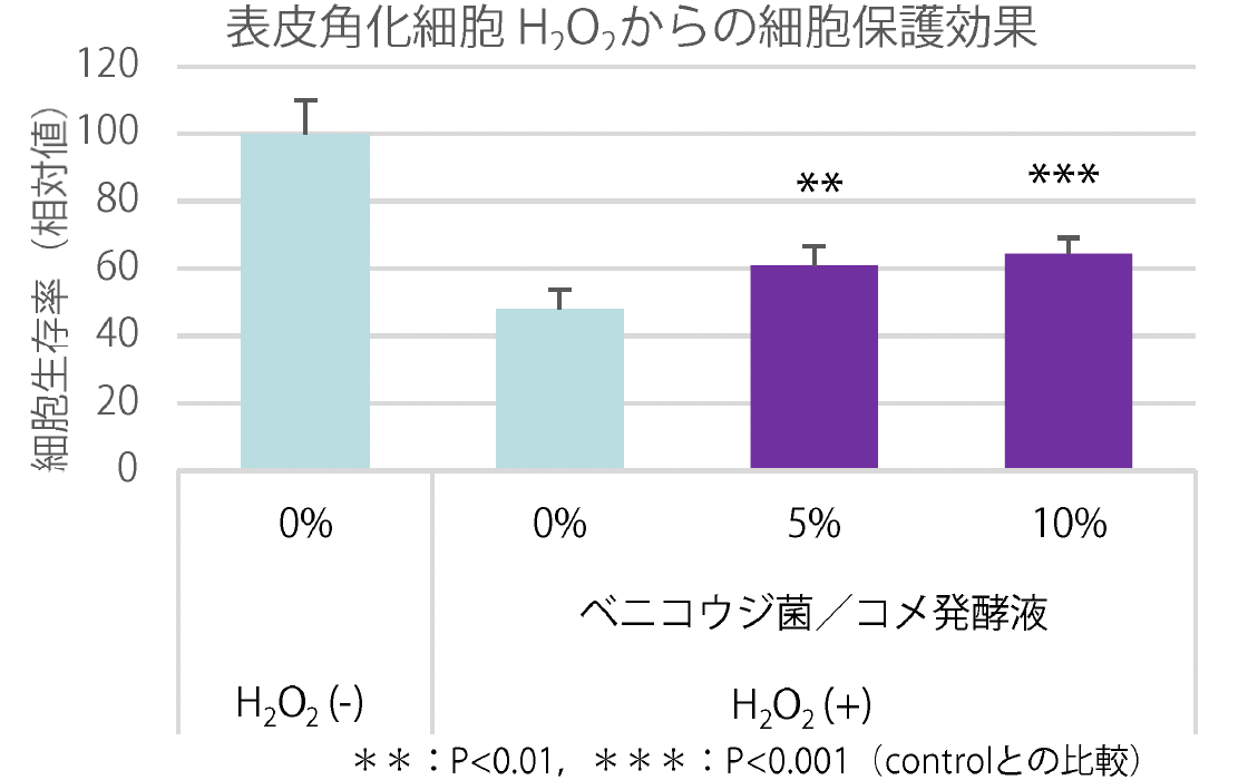 続いて活性酸素(H2O2)からの細胞保護効果を、ベニコウジ菌/コメ発酵液とともに与えた場合の正常ヒト表皮角化細胞の生存率で評価した。グラフに示すように、ベニコウジ菌/コメ発酵液の添加濃度依存的に細胞生存率が上昇することが確認された。
