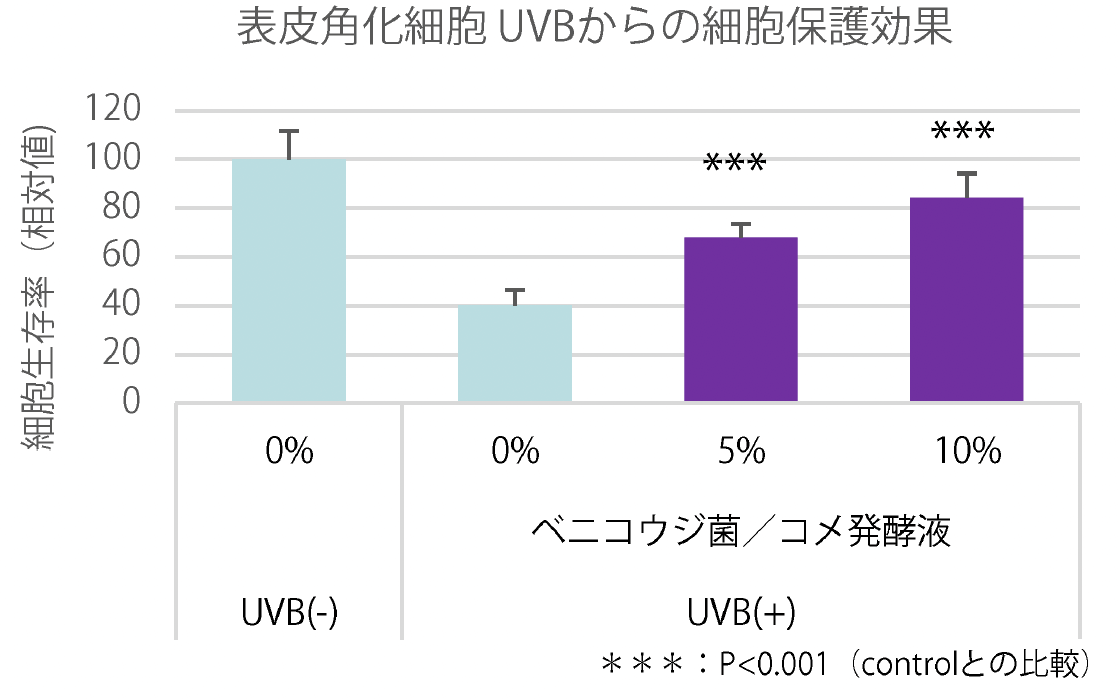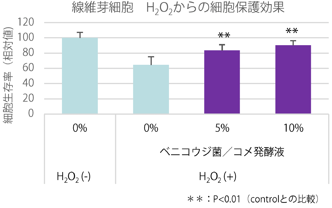 結果としてベニコウジ菌/コメ発酵液は、紫外線を与えた場合においても、添加濃度依存的に酸化傷害による細胞生存率の低下を抑制し、細胞を保護する効果が確認された。