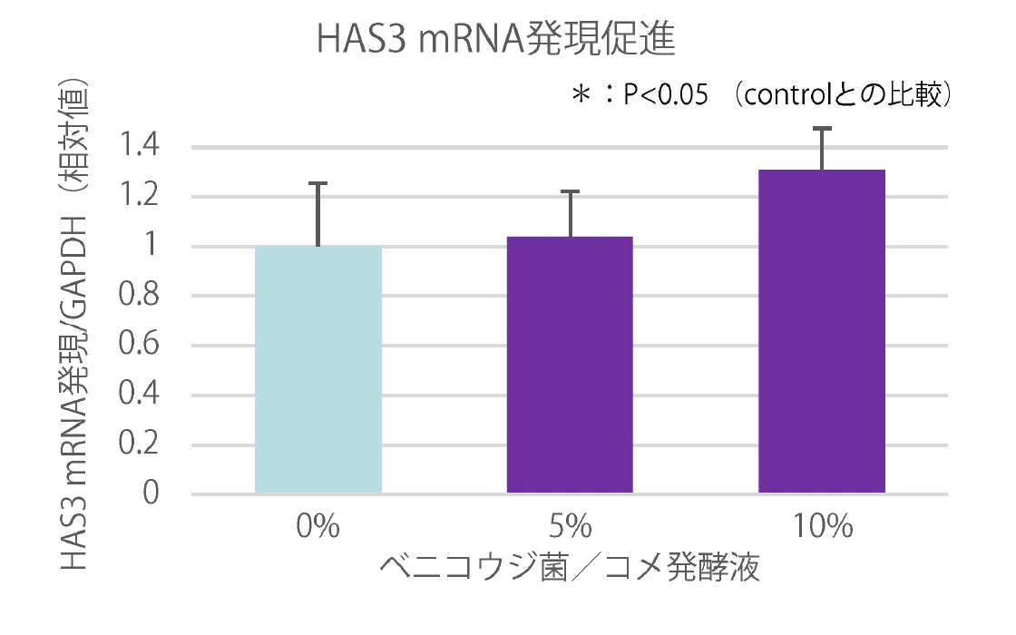 正常ヒト表皮角化細胞を用いたヒアルロン酸産生試験の結果、ベニコウジ菌/コメ発酵液は表皮ヒアルロン酸合成酵素(HAS3)mRNAの発現を促進させることが認められた。