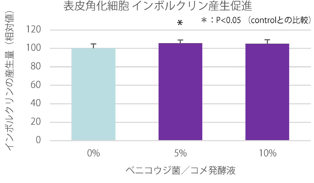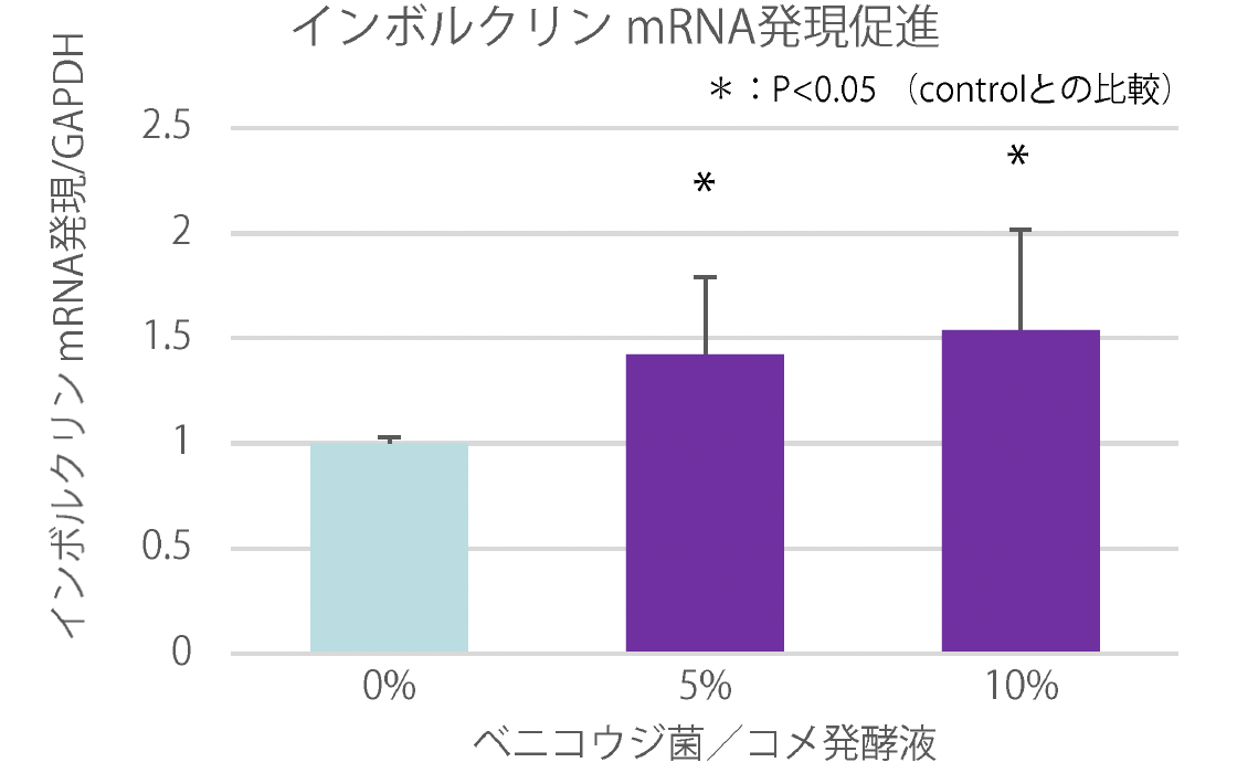 正常ヒト表皮角化細胞(NHEK)を用いたインボルクリン産生試験の結果、ベニコウジ菌/コメ発酵液は、インボルクリンmRNAの発現を促進し、さらにインボルクリン産生量を増加させることが認められた。