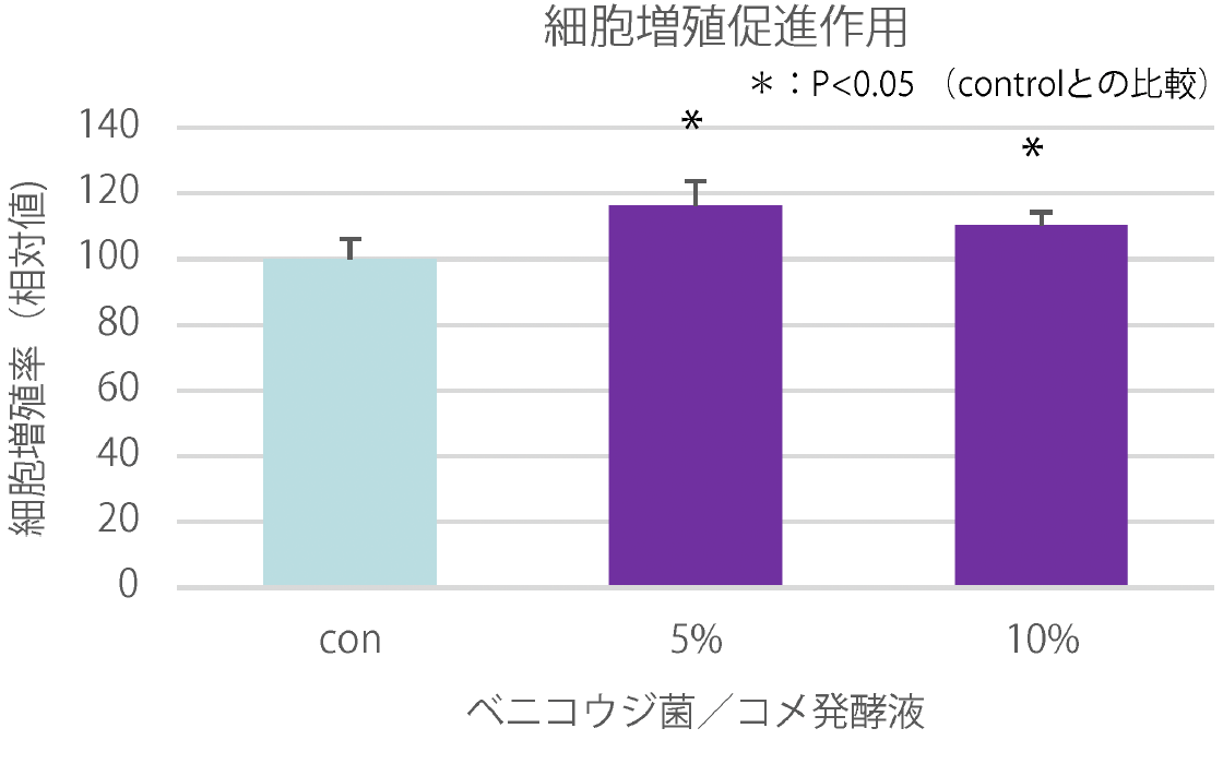 正常ヒト表皮角化細胞を用いた細胞増殖試験の結果、ベニコウジ菌/コメ発酵液は、有意な細胞賦活作用を有することが認められた。