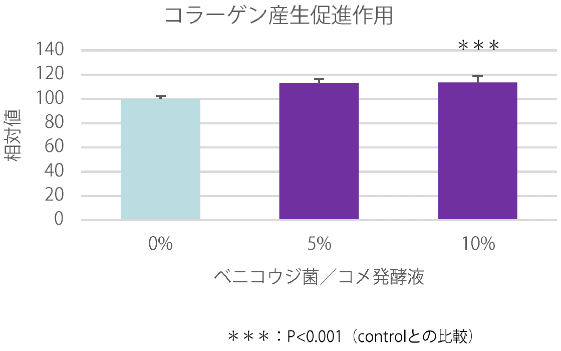 正常ヒト線維芽細胞を用いたコラーゲン産生試験の結果、発酵液は有意なコラーゲン産生促進作用を有することが認められた。このことからベニコウジ菌/コメ発酵液は、線維芽細胞のコラーゲン産生能を高め、シワやたるみなどを改善する効果が期待される。