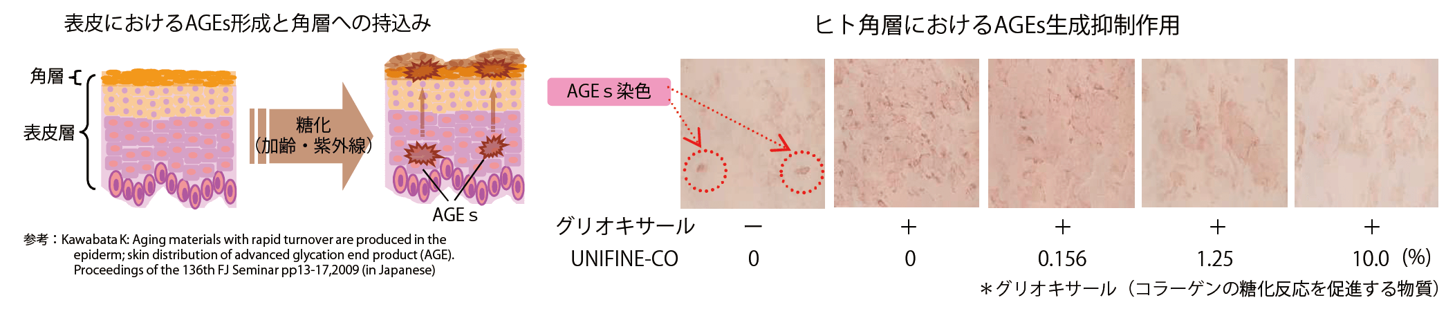 その結果、発酵イソフラボンは、グリオキサールにより誘導されるAGEs生成を抑制することが確認された。一方で、「第27回IFSCC Congress」2009(国際化粧品技術者会連盟)において、表皮AGEsについて以下のような内容が報告されている。