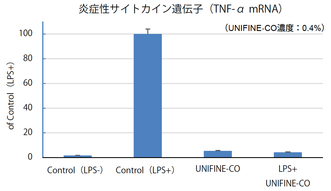 ニキビは、皮脂腺や毛包が炎症を起こしている状態である。そこで皮脂腺細胞における発酵イソフラボンの抗炎症作用について評価した。ヒト皮脂腺細胞(SZ95)を用いて大腸菌LPSの刺激により誘発する炎症性サイトカインTNF-αの遺伝子発現の抑制効果として評価を実施した。TNF-αは炎症の主な原因物質である。