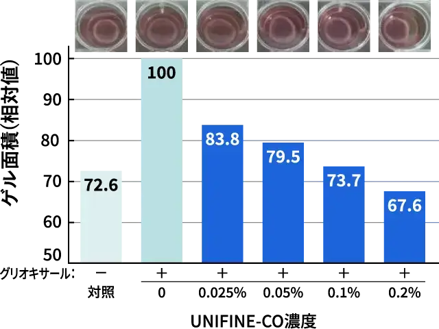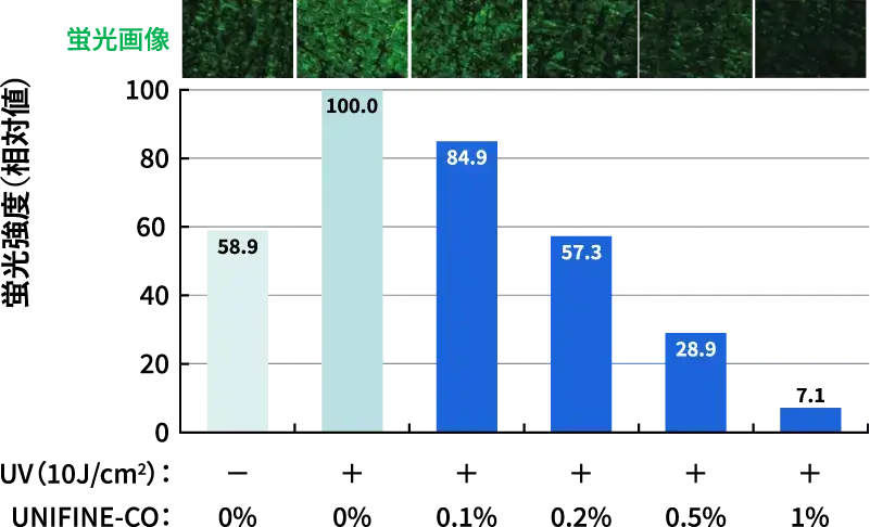 その結果、対照と比較して、UNIFINE-COを塗布した場合にはDHAによる褐変が抑制されたことから、UNIFINE-COは糖化(=老化)による肌の透明感の低下を防⽌する効果が期待される。