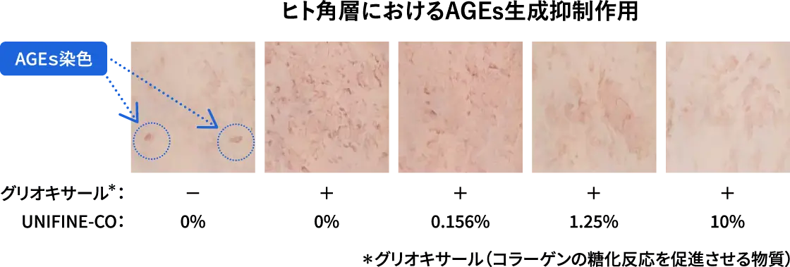 角層や表皮の主要タンパク質であるケラチンが糖化により褐変すると肌の透明感が低下すると考えられている。一方、ジヒドロキシアセトン(DHA)は、タンニング剤として肌の色を褐色に着色するが、この着色は角層中のタンパク質との糖化反応によるものとされている。このDHAの糖化による肌の褐変化を指標に、UNIFINE-COの角層での糖化抑制作用を評価した。