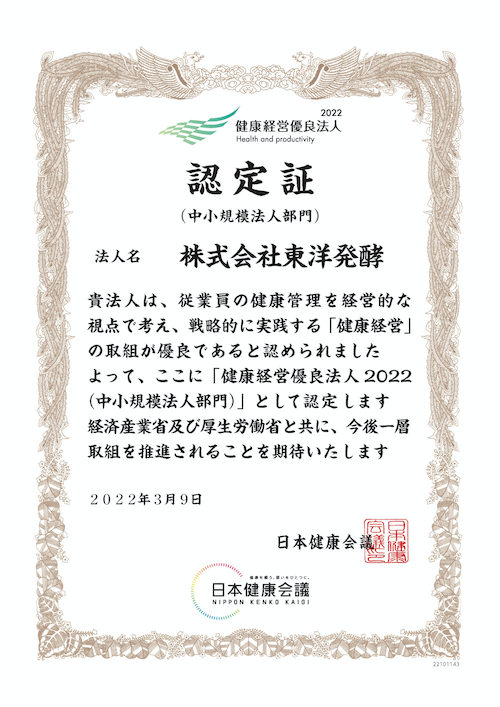 株式会社東洋発酵はこの度、経済産業省と日本健康会議が進める「健康経営優良法人認定制度」において、