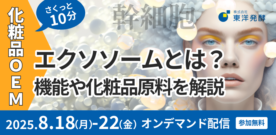 「化粧品づくりに興味がある」、「自社ブランドを持ちたい」と化粧品分野のビジネスに関心があるものの、何から学べばよいか迷っている方を対象に、話題のエクソソームについて、基礎知識や化粧品に配合する場合の原料を解説するウェビナーを開催します。