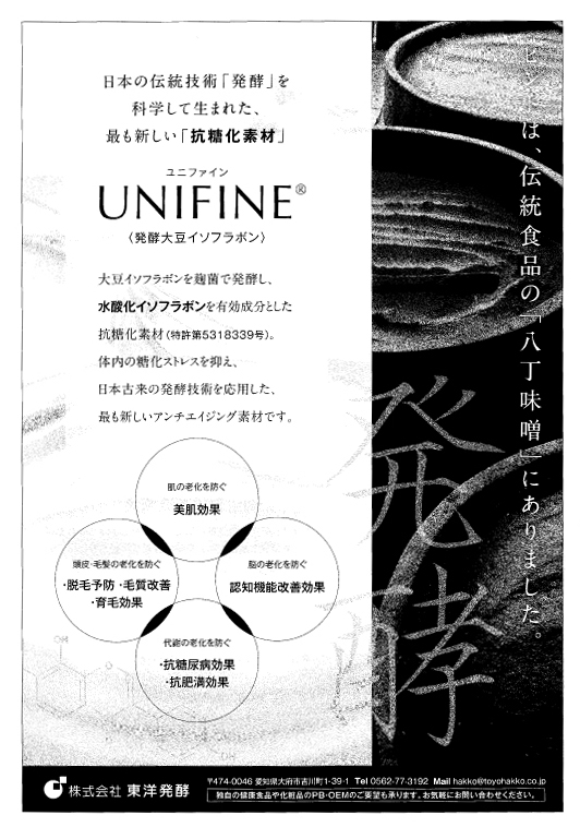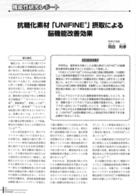 プレスリリース 2019年10月8日2021年9月24日 『FOOD Style 21』(10/10発行)掲載のお知らせ 抗糖化素材「UNIFINE®(ユニファイン)」摂取による脳機能改善効果が、科学情報誌『FOOD Style 21』10月号(10月10日発行)に掲載されます。 詳細はお問い合わせよりご要望ください。 弊社よりご連絡差し上げます。 『UNIFINE®』のこれまでの試験データは以下頁に掲載されています。 UNIFINE®