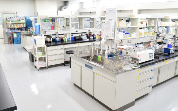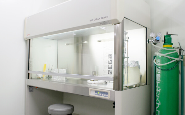 HEPAフィルターを通したエアを導入し、クリーンな環境を整えています。無菌操作を行うためのクリーンベンチも4台保有しており、各種微生物試験や培養細胞を用いた機能性評価試験を行っています。