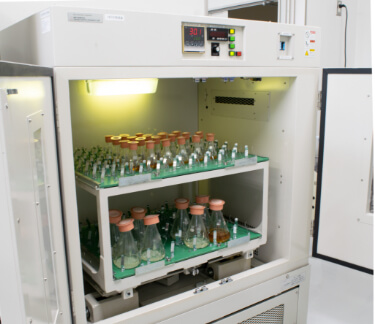 一度に150本以上ものフラスコを振盪させることができる大型培養装置や、温度, pH,攪拌速度等のパラメータを設定できる5L6連培養装置を保有しています。最適な培養条件を追求しながら、高い機能性を有する新規発酵素材の開発を行っています。