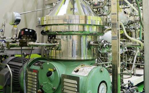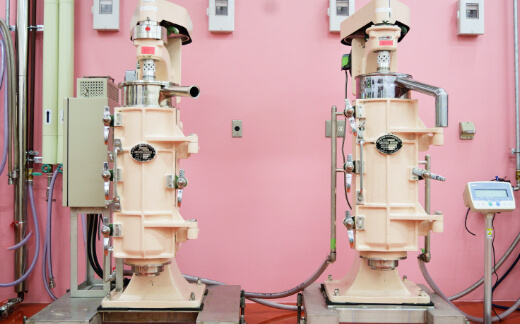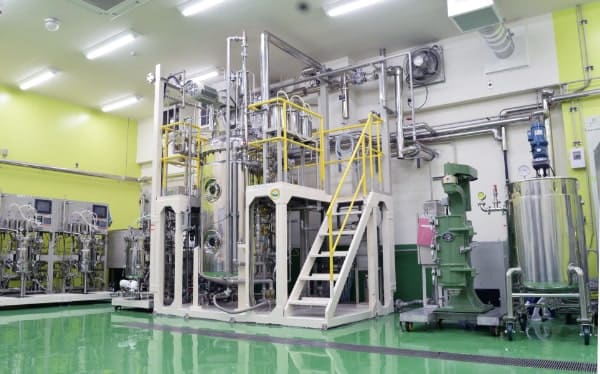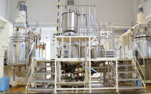食品原料や化粧品原料を製造するエリア。試験用途で使用する30L発酵槽や生産用の1500L発酵槽、また発酵物のろ過・精製に使用する遠心分離機, フィルタープレスを保有しています。